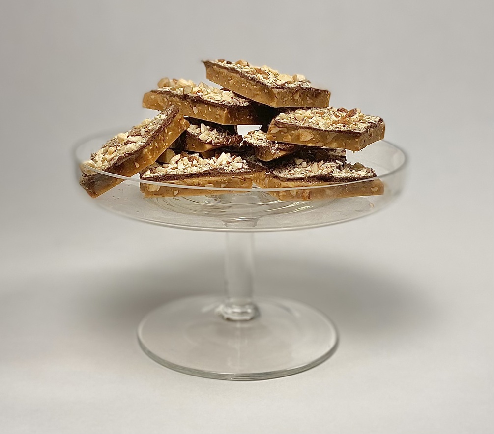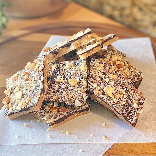 My English Toffee is made with the freshest and most premium ingredients I can find! Crunchy, buttery toffee with almonds and dark chocolate then topped with more toasty almonds and broken into pieces that can be shared or not!